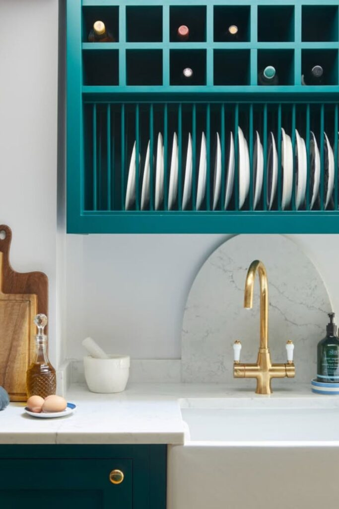 Get the most use from your space with a wall-mounted wine and dish rack combo. The top section holds wine bottles. The bottom organizes plates vertically for drying or quick access. Painted in a bold teal color, this custom piece adds a pop of color and works as a design feature. Perfect for small kitchens, this compact unit mixes elegance and efficiency, making sure no space is wasted.
