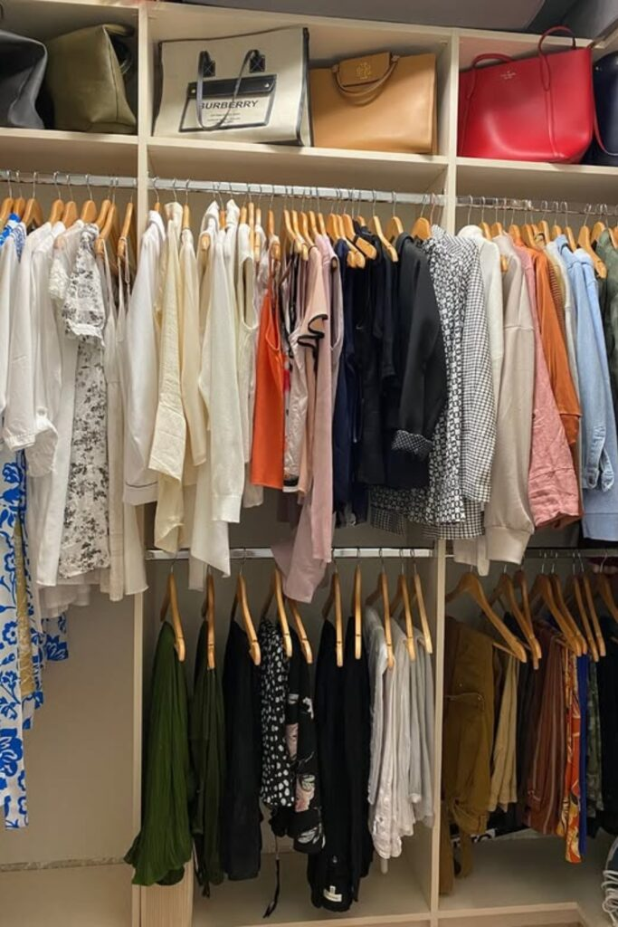 Put the clothes you wear often front and center, at eye level. Group them by purpose, like work clothes or casual outfits. Move the rarely worn items to the sides, top shelves, or under the bed.