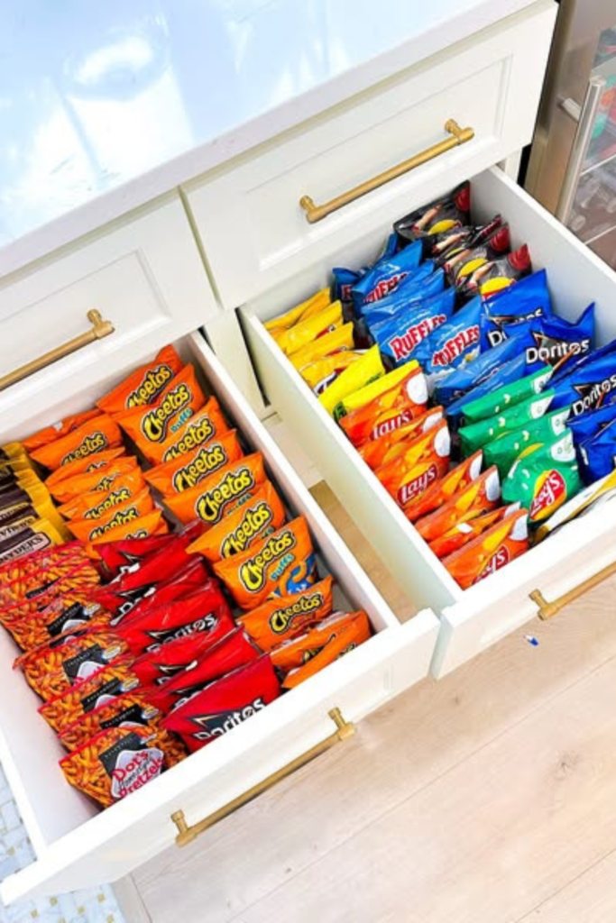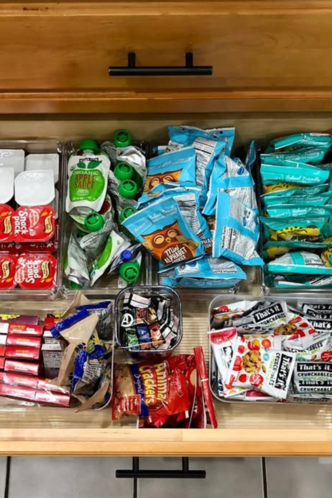 Assign a dedicated shelf for snacks and split by purpose: kids, treats, quick bites.