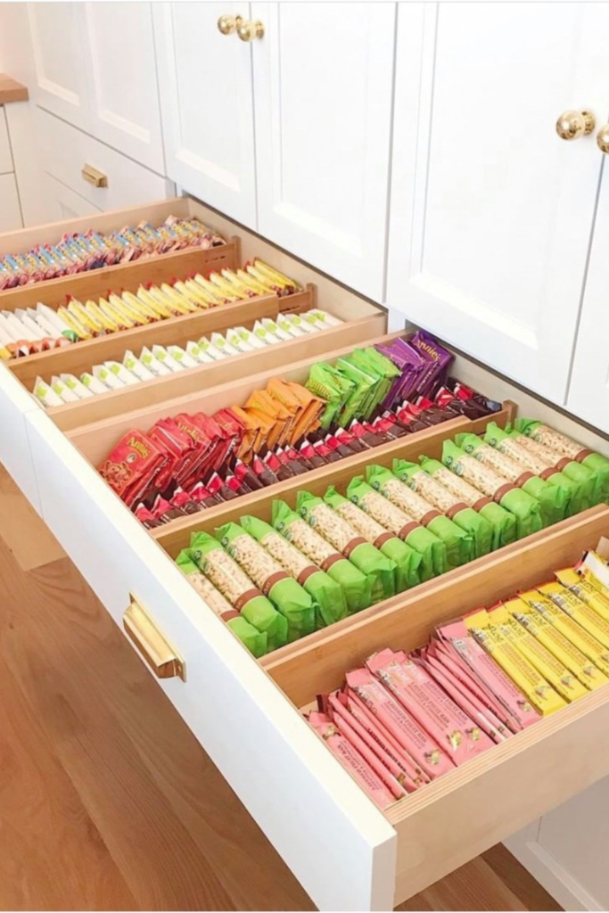 Organize snack bars by type in wide, deep drawers.