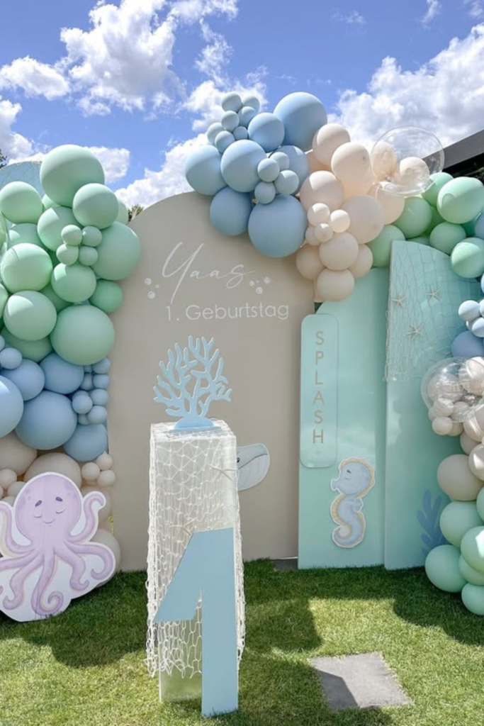 A cute sea creature backdrop with a playful number display and balloon arch makes the space feel sweet and friendly.