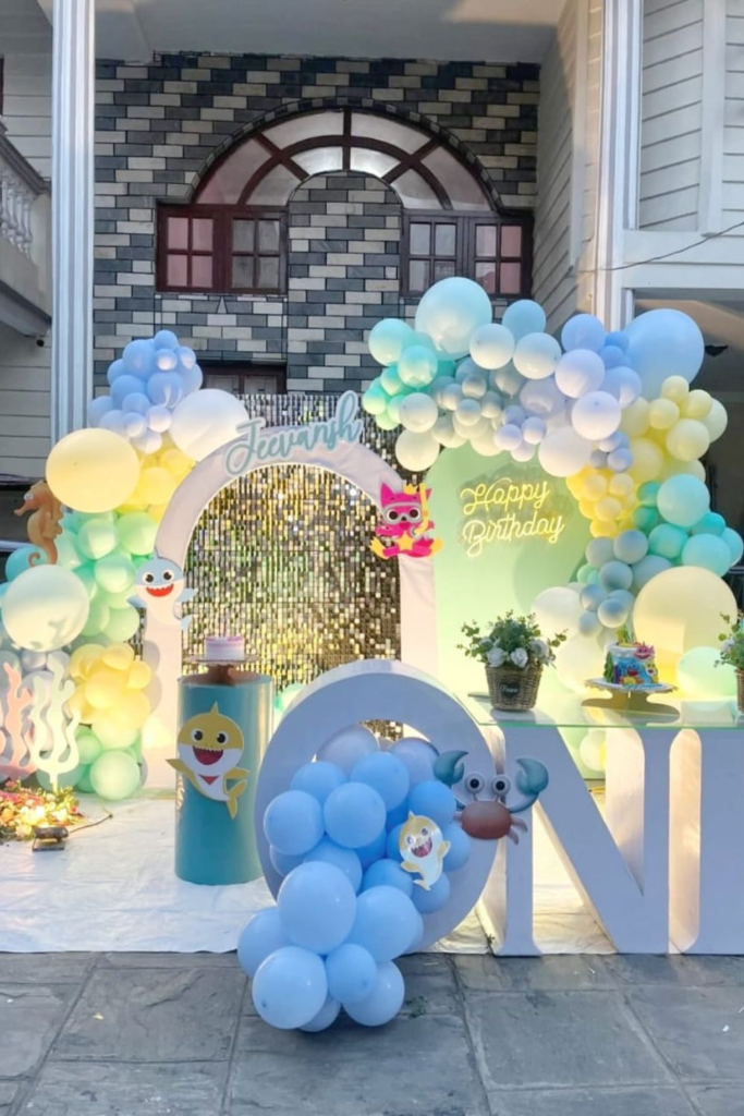The baby shark setup focuses on bright balloon arches in yellow, aqua, and white that bring lively energy.