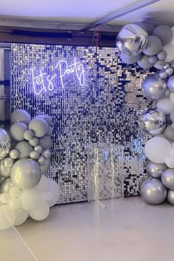 Pairing silver and white balloons with a shimmer wall adds shine without being too busy.