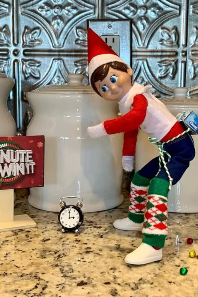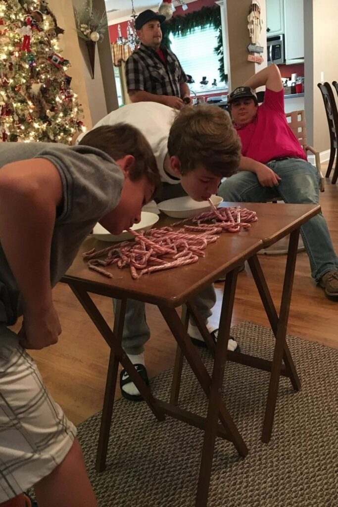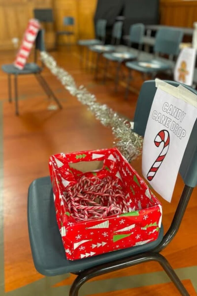 This is another fun holiday challenge. A player stands on a chair and tries to drop candy canes into a box or container on the floor below. They have one minute to get as many candy canes into the box as they can. String lights nearby give it a nice glow.