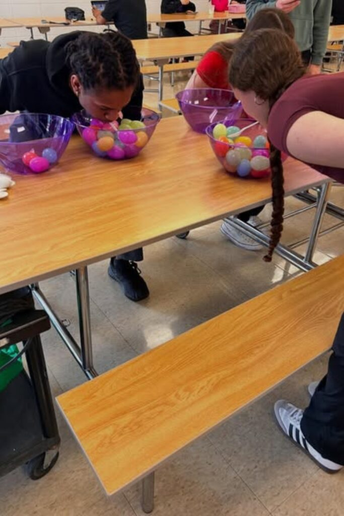 This game gets people moving quickly. You need two bowls and some lightweight plastic eggs. Players must use only their mouth to pick up an egg and move it from one bowl to the other. They try to move as many as they can in a minute.