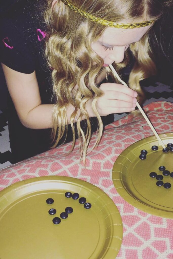 Players use a drinking straw to pick up small candies from one plate and move them to another plate. They must do this as fast as they can for one minute. You just need straws, candy, and two plates for this quick and simple challenge.