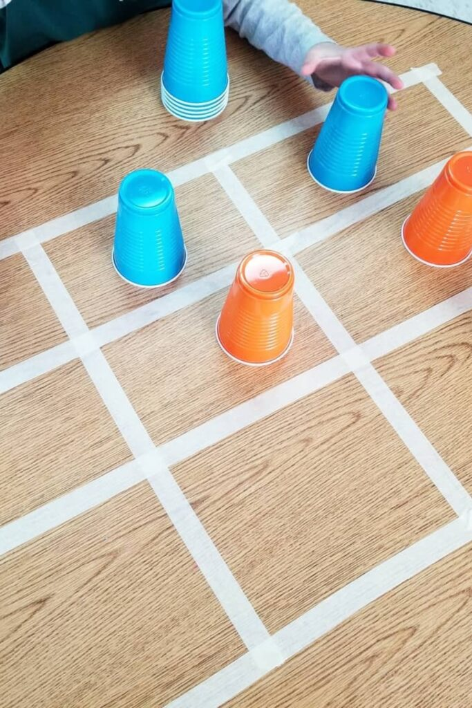 This turns a classic paper game into a live race. Use tape to make a tic-tac-toe grid on the floor. Two teams have differently colored cups. They race to place their cups on the grid to get three in a row, all within one minute per turn.