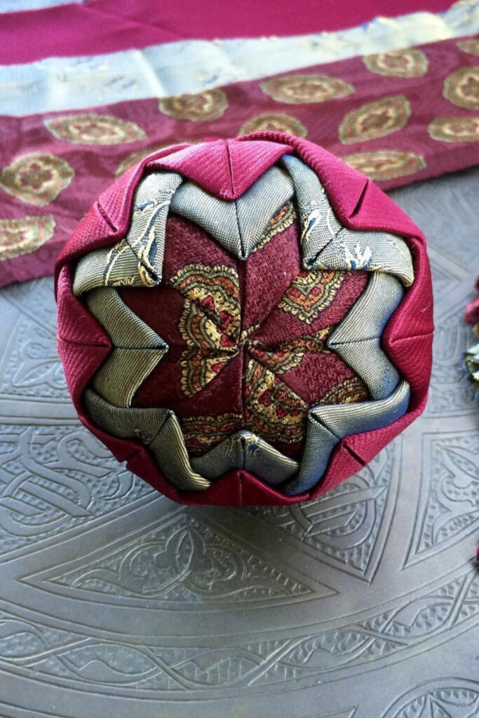 You take pieces of silk from different ties and fold them into points. Then you pin them around a simple foam ball to create a star pattern. The best part is that you do not need to know how to sew.
