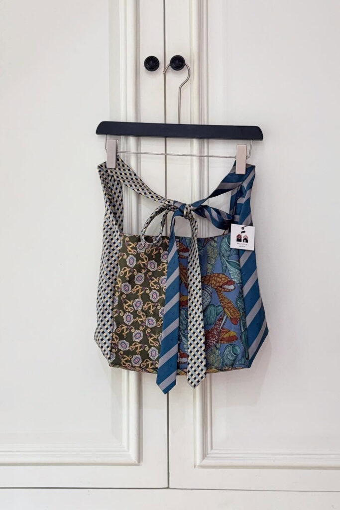 Each tie becomes one panel of the bag. When you sew them together, they create a patchwork design. You need to add a strong fabric backing to make the bag sturdy.