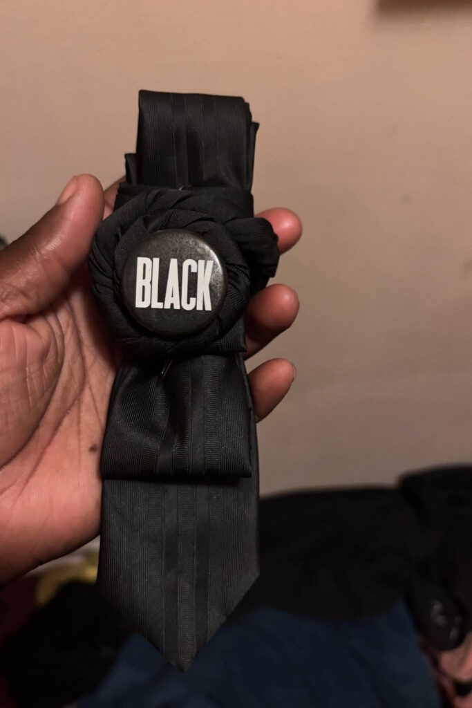 This design uses a black tie folded into layered loops. A button or a badge in the center finishes the look. Take the wide end of the tie and fold it into a rosette shape.