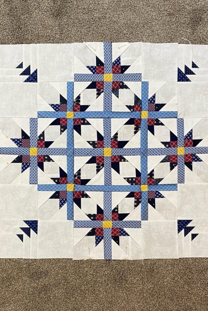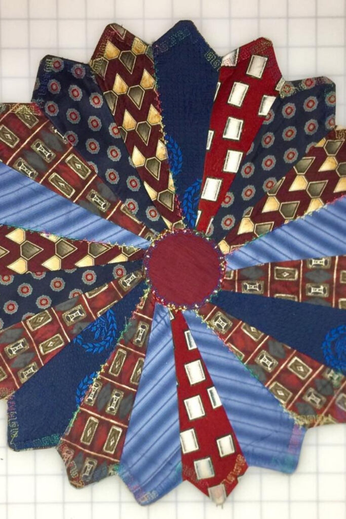 This block uses sections of patterned ties arranged in a star and ring shape. You use solid fabrics to make the colors pop. First, you carefully take the ties apart and press them flat.