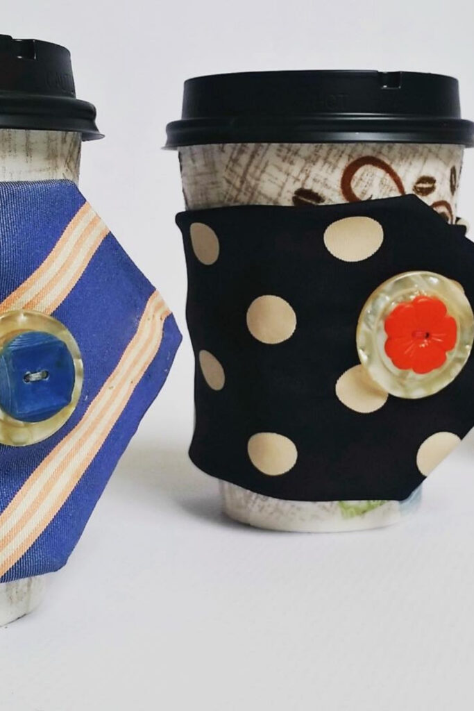 The pointed end of a tie wraps around a cup perfectly. A simple button closure holds it in place. Cut a section of the tie that is wide enough to fit around a cup.