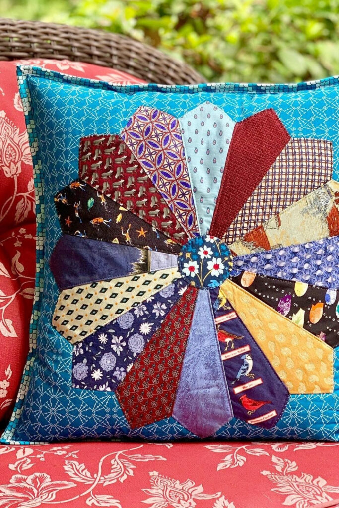 The design features ties cut into petal shapes. You arrange them in a Dresden-style circle on a fabric pillow base. Open the ties up and iron them flat.