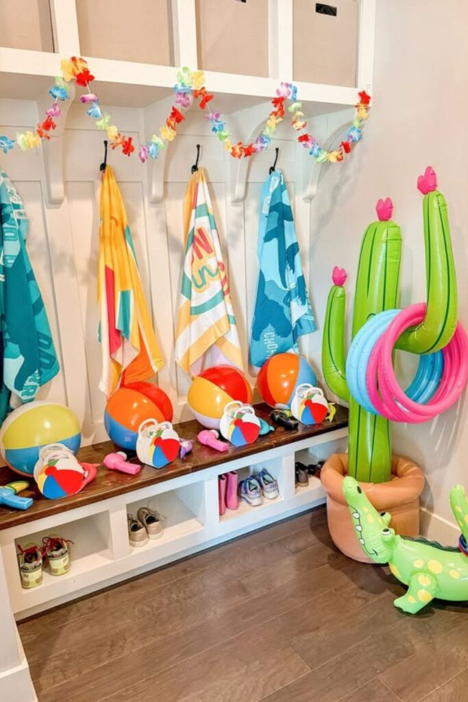 A beach bag station keeps summer events organized and fun.