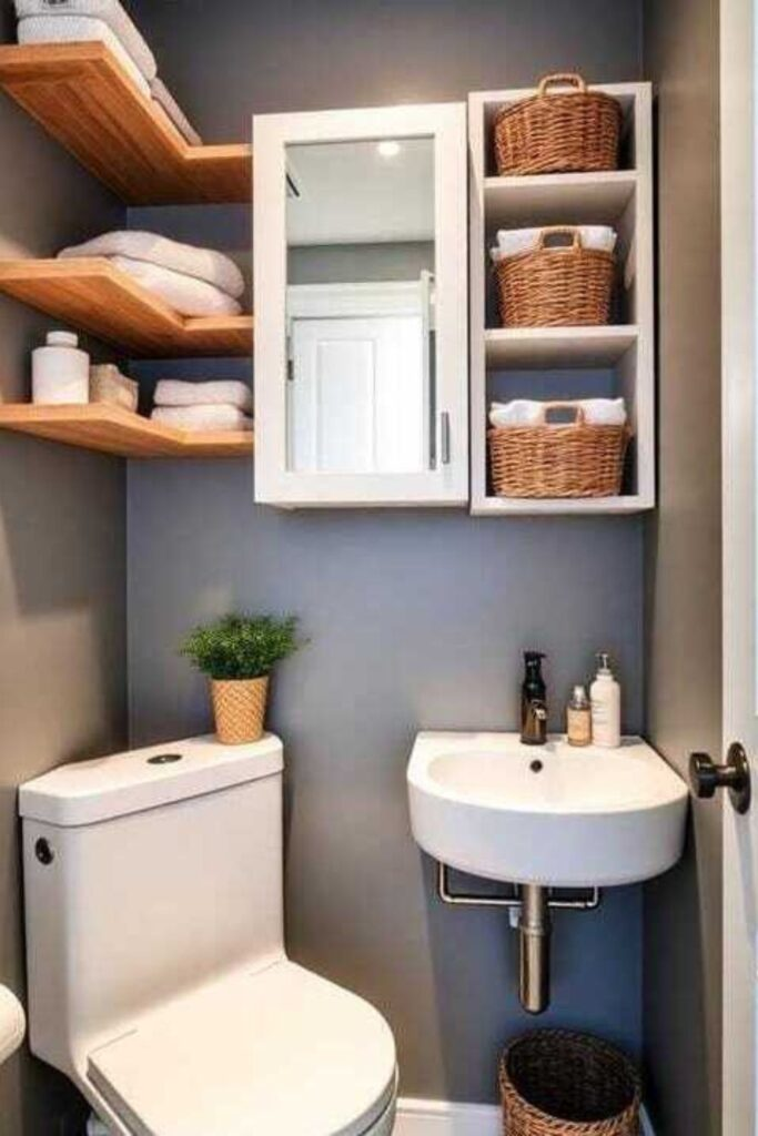 Maximize small spaces with floating wooden shelves paired with a compact wall cabinet. This setup blends open shelving for towels and basket-organized cubbies. It creates a cozy, functional look. It is perfect for renters or small bathrooms.