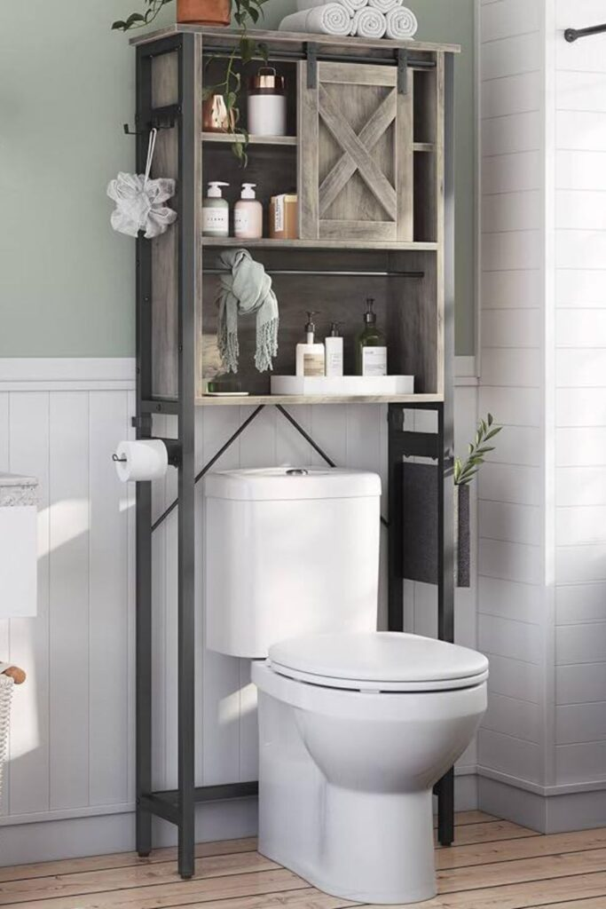 Transform your bathroom with a dark wood cabinet featuring barn-style doors and sturdy black metal legs. This farmhouse-inspired piece sits above the toilet, offering closed storage for essentials and an open shelf for candles or rolled towels. It’s a space-saving design that adds warmth and charm to neutral-toned bathrooms.