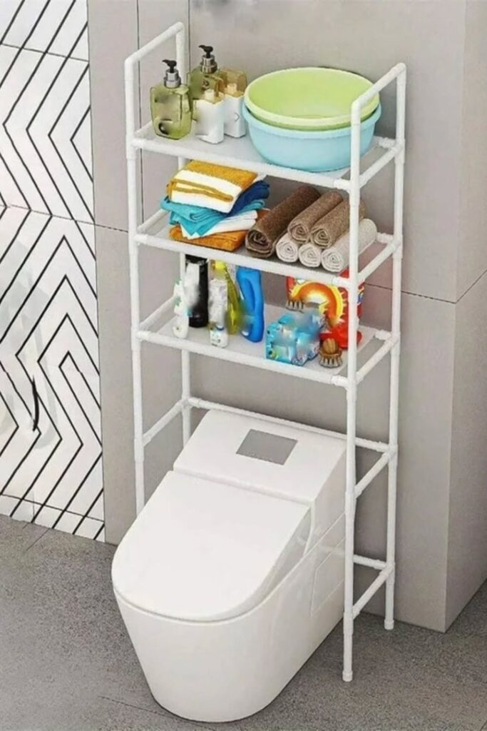Simplify storage with a full-frame unit that wraps around the toilet. It features multiple compartments, a top shelf, and a central open area. This white organizer is perfect for modern bathrooms. Store everything from beauty products to toilet paper in one sleek spot.