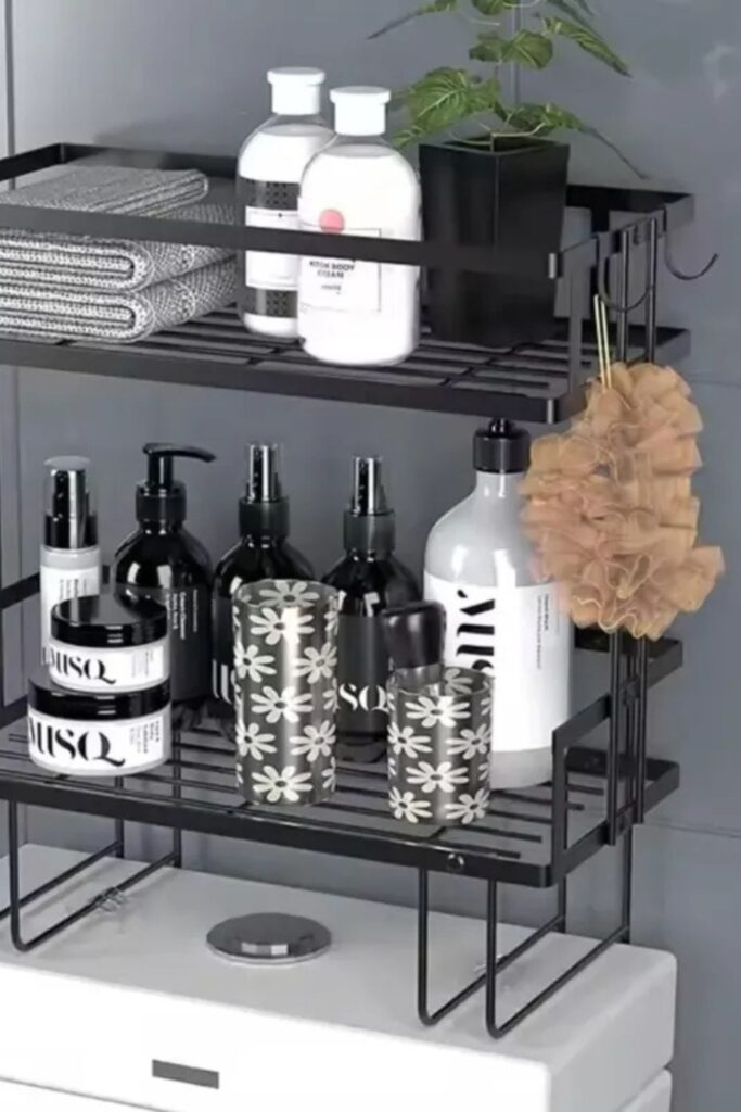 Add industrial flair with a matte black double-decker shelf. Mounted above the tank, it holds towels, shampoos, and plants on its sturdy tiers. Side hooks provide extra space for accessories.