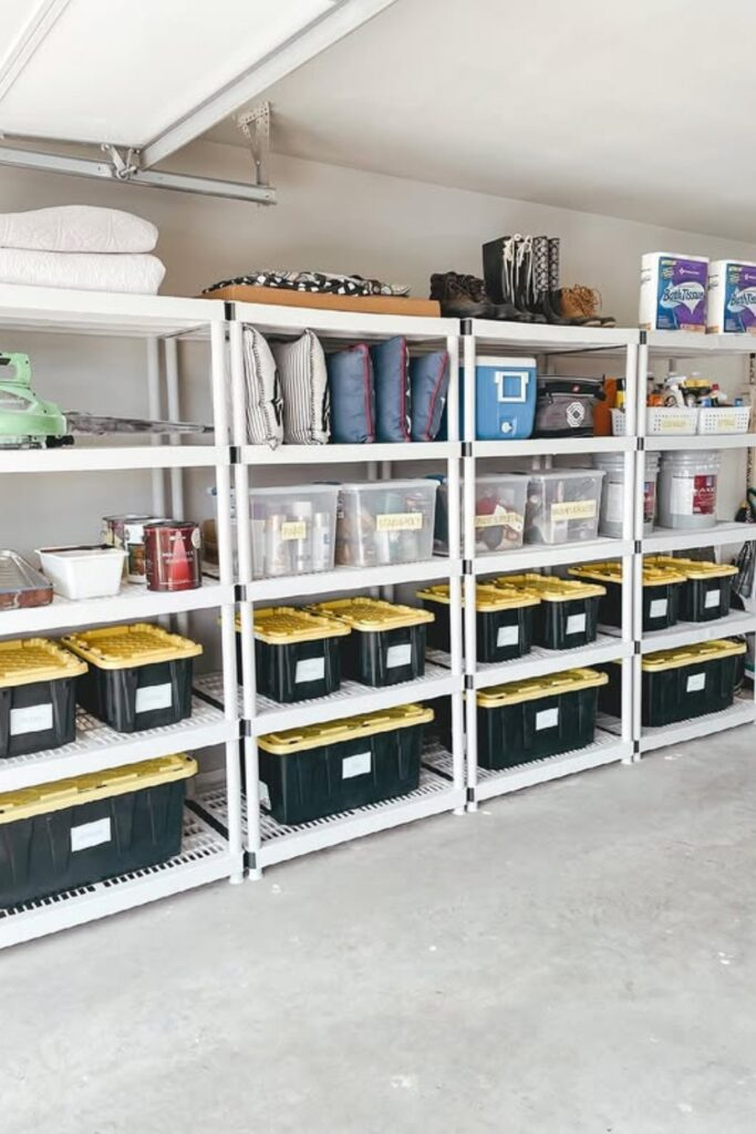 Store camping gear, tools, and sports items in clear bins so you can see everything. Keep outdoor boots and shoes on the bottom shelf for easy access.