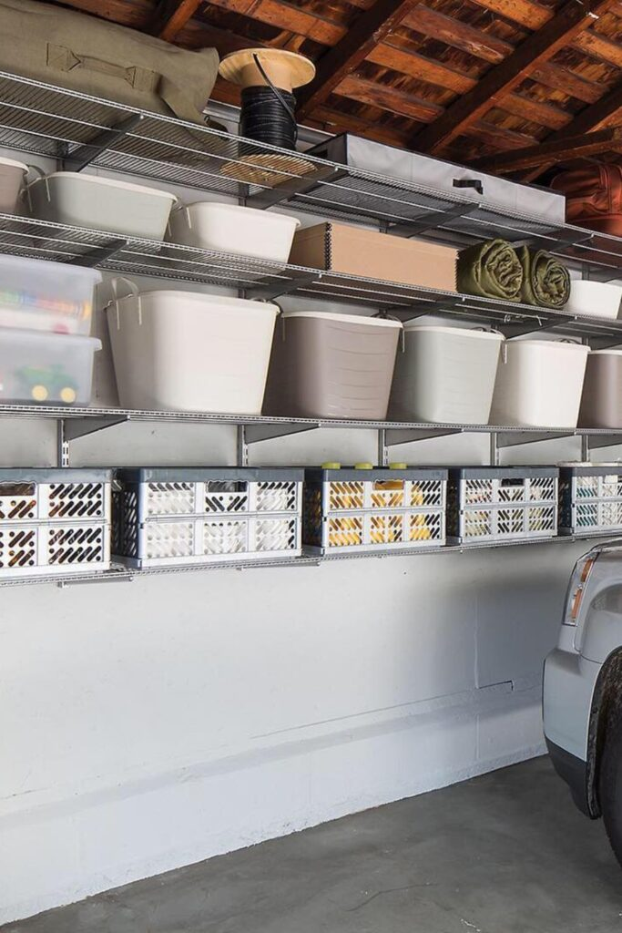 You can still park your car underneath. Use ventilated crates on the lower shelves for items you use often.