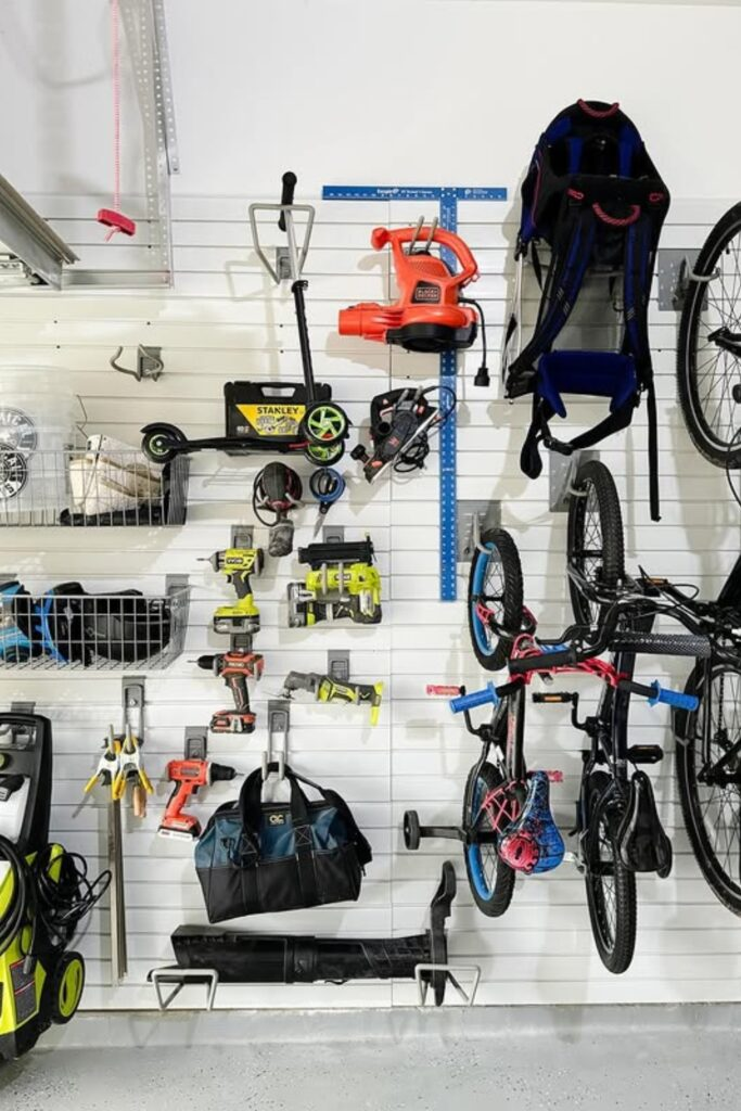 Make one wall work for your whole family. Use a slatwall to hold bikes, tools, and kids’ gear all together.