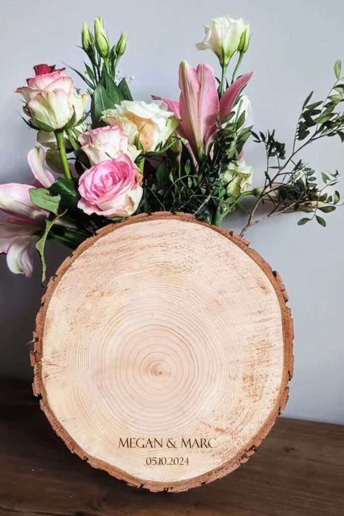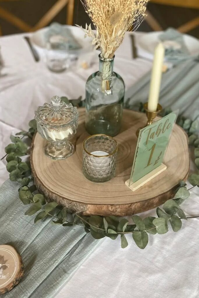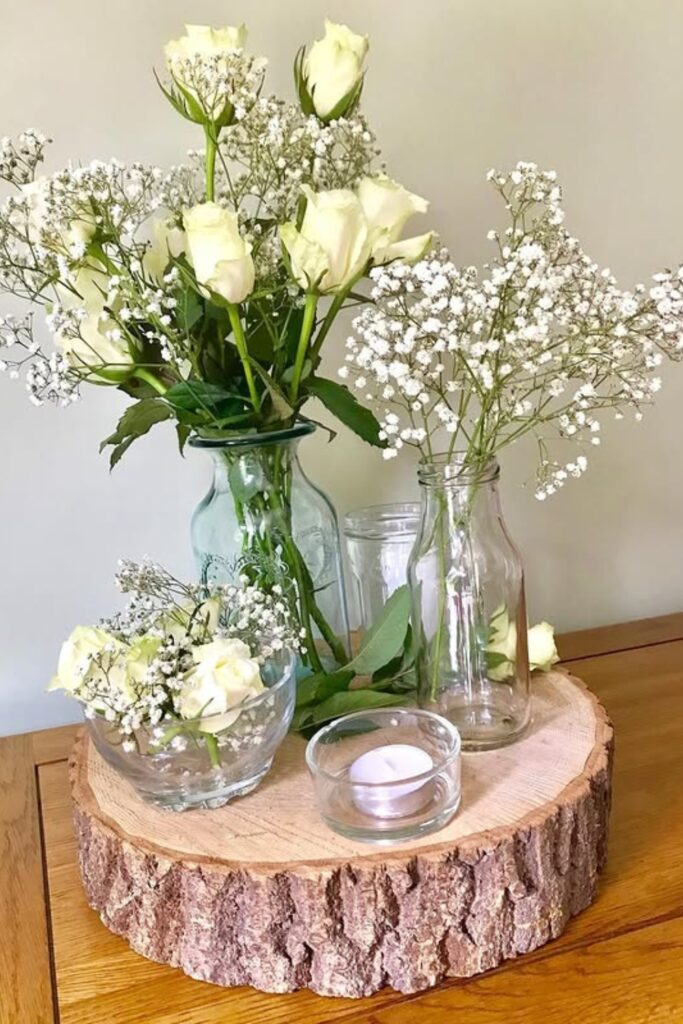 Place simple bottles with flowers on wood slices for a rustic feel.