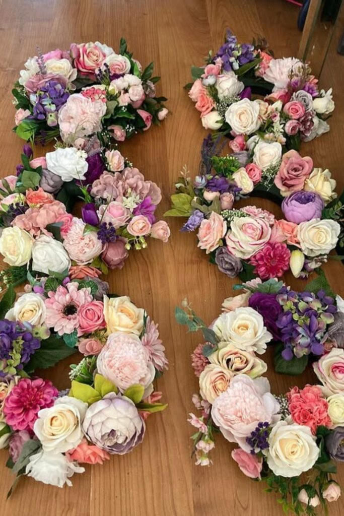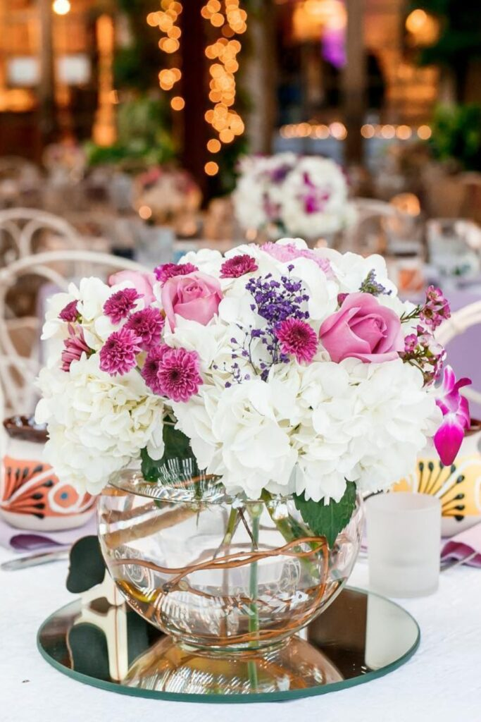 Fill round bowls with flowers to make the arrangement look lush and full.