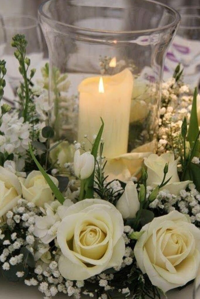 Place a large candle inside a glass hurricane and surround it with roses and baby’s breath.