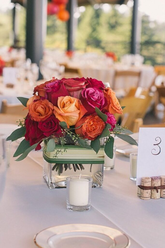 Arrange red, orange, and pink roses in a clear vase for vibrant impact.