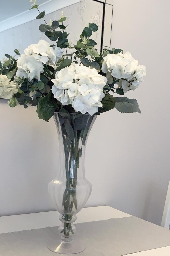 Fill a tall, clear vase with hydrangeas, eucalyptus, or roses.