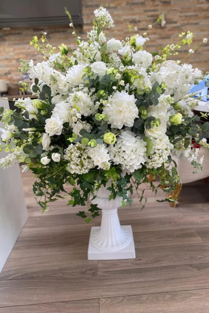 Use overflowing white flowers like roses and hydrangeas for a clean, timeless look.