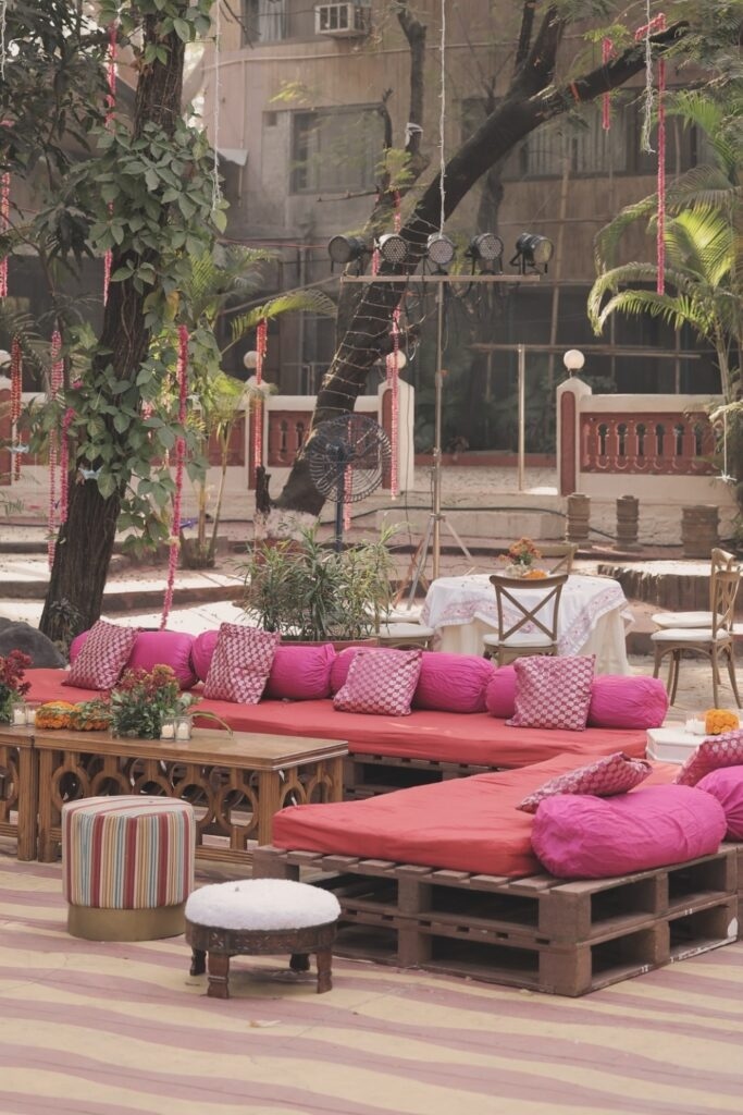 Create a soft, romantic lounge area with fabric and simple furniture. Hang white sheets or fabric from a simple frame to create walls. Arrange comfortable seating using borrowed sofas or chairs.