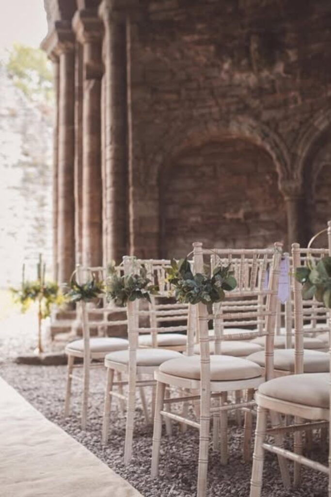 For a rustic seating arrangement, use wooden benches or chairs without cushions. Decorate each aisle chair with a simple bundle of greenery tied with burlap ribbon or twine. Eucalyptus, olive branches, or ferns work well for this.
