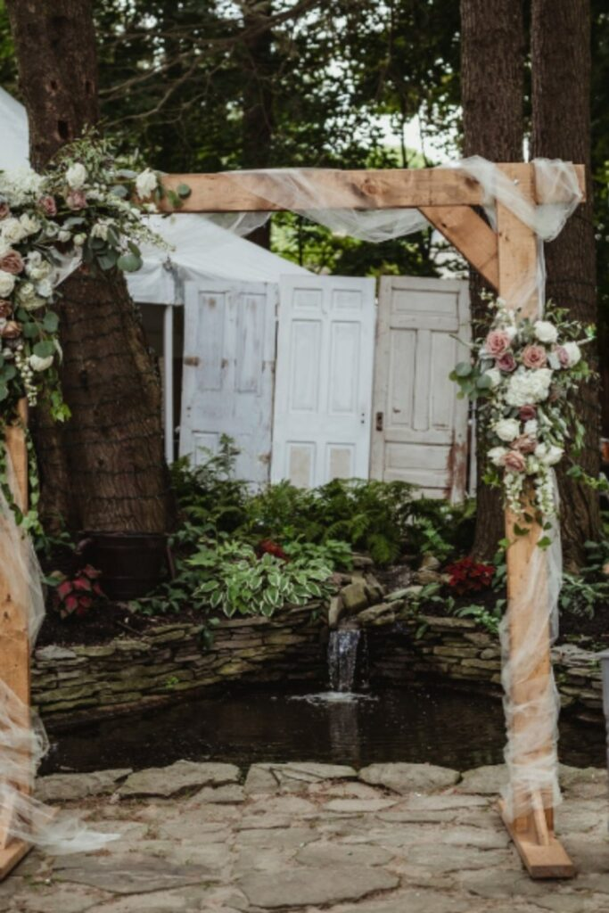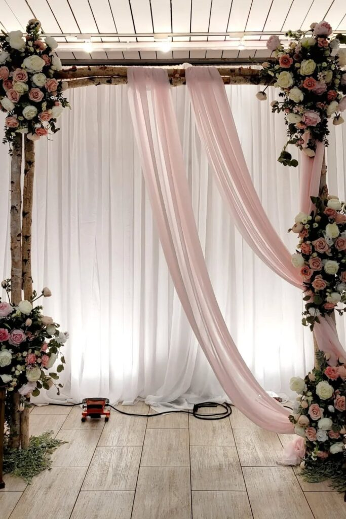 Create a romantic arch using birch branches secured together with wire. Drape soft, sheer fabric in your wedding color over the structure, allowing it to flow to the ground. Weave fairy lights through.