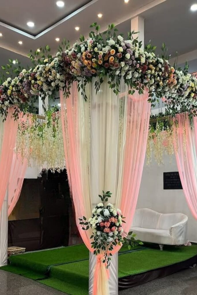 Place battery-operated candles along the base or hang them from the roof edges to cast a warm glow as evening approaches. The combination of fabric, lights, and simple florals creates an elegant look that feels expensive but isn’t.