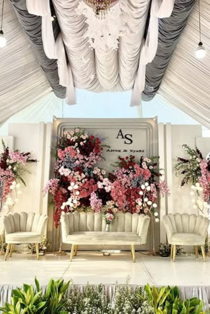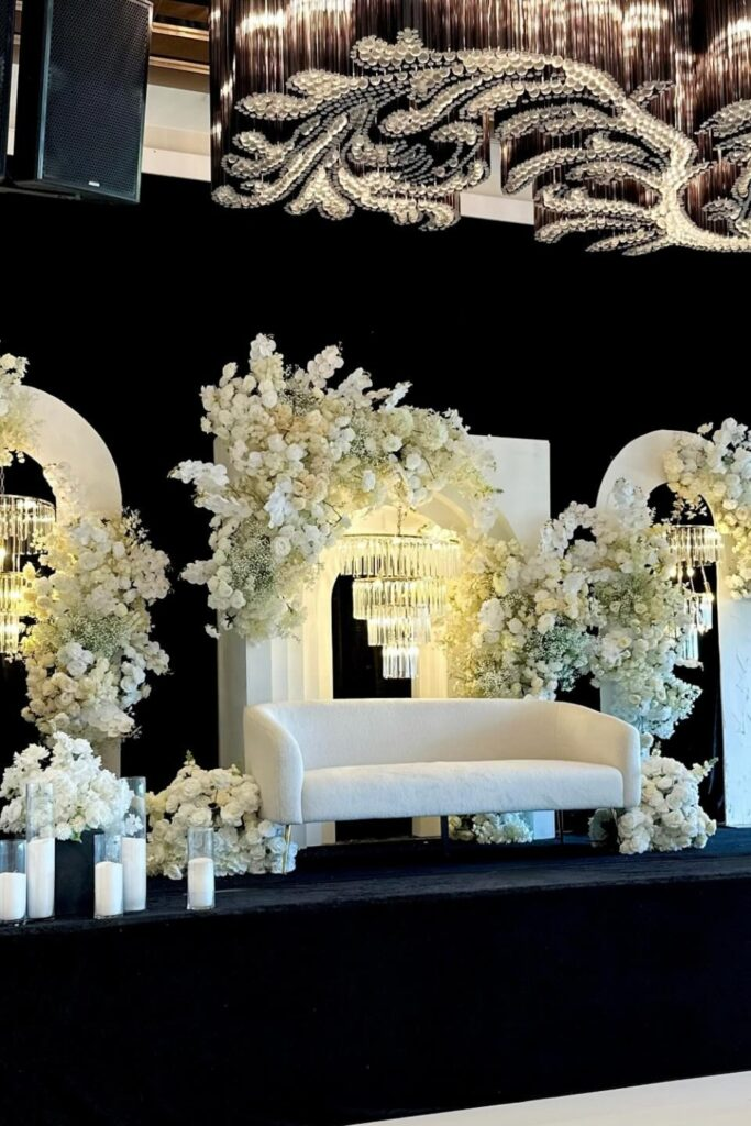 Create a timeless floral stage using symmetrical arrangements. Use pairs of large vases or urns filled with affordable flowers like baby’s breath, carnations, and daisies. Flank your stage with these identical arrangements.