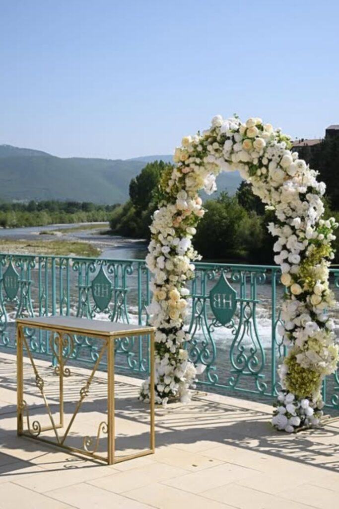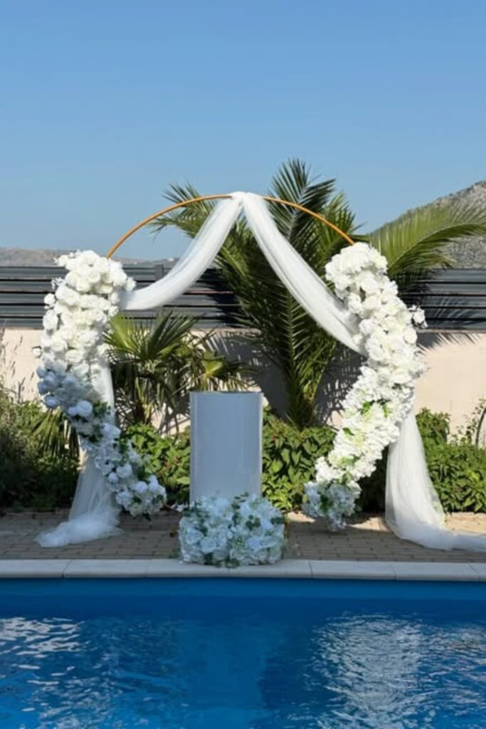 For a poolside ceremony, create a light, airy arch that complements the water setting. Use a white arch structure and decorate primarily with white flowers and greenery. Incorporate flowing white fabric that moves gently.