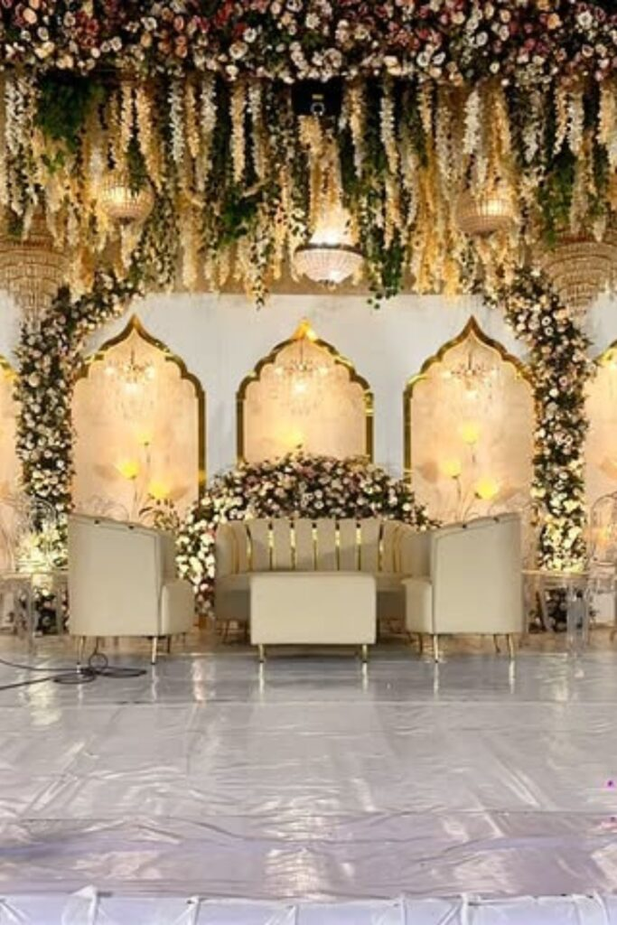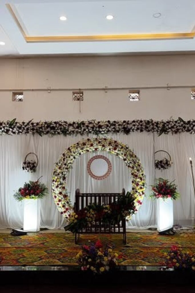 Create an elegant stage area using fabric drapes and floral arrangements. Hang sheer curtains from a simple frame or existing structures. Create large floral arrangements using affordable flowers like carnations or chrysanthemums mixed with greenery.