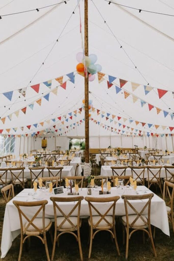 Transform a plain tent with fabric and lights. Drape colorful fabric swags from the center point to the edges of the tent. Create paper pom-poms in various sizes and colors to hang at different heights throughout the space.