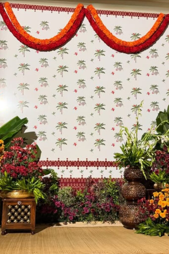 Flank the backdrop with topiaries made by attaching artificial boxwood to foam cones. The formal, balanced arrangement feels traditional and elegant while being completely DIY and budget-friendly.