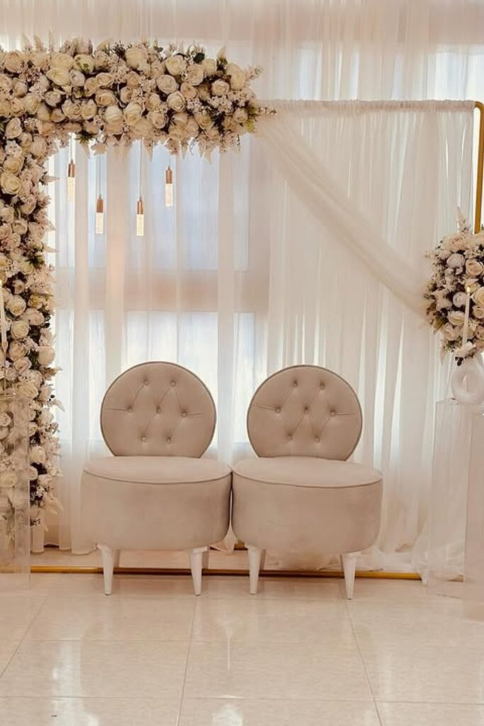 Place a simple white bench or two white chairs in front. Add a white rug and a few white pillows. The limited color palette creates a calm, serene atmosphere that feels both modern and romantic.
