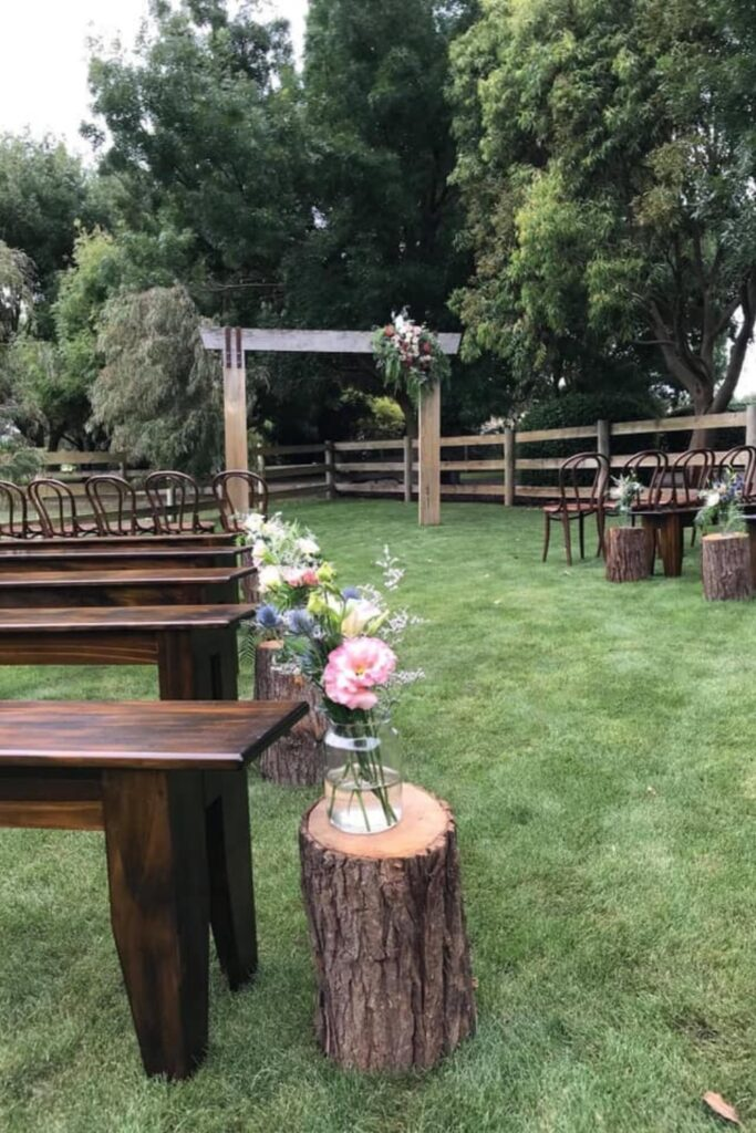 Between chairs, place small wooden stumps with candles secured on top (use battery-operated for safety). This creates a beautiful aisle lining that guides guests to their seats while adding to the rustic atmosphere.