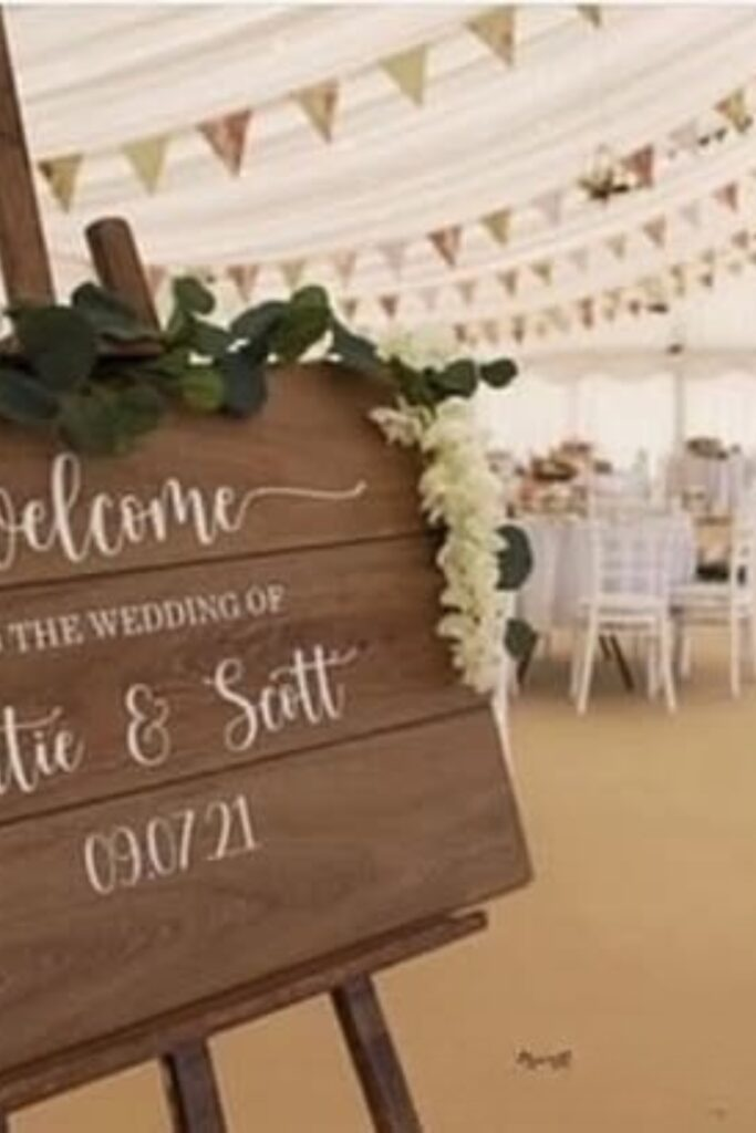 Decorate the edges with a simple floral wreath made from artificial flowers. Place the sign on an easel at the entrance to your marquee. Add a burlap banner or ribbon for extra texture.