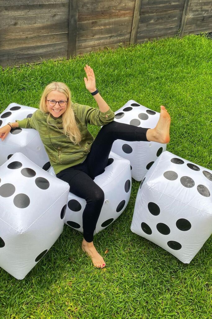 Oversized inflatable dice bring a playful twist to your backyard fun.