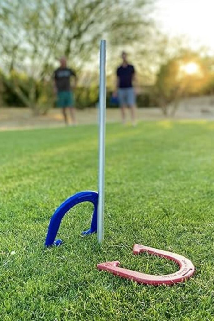 Players toss horseshoes at stakes, aiming for that satisfying “clang” with every perfect ringer.