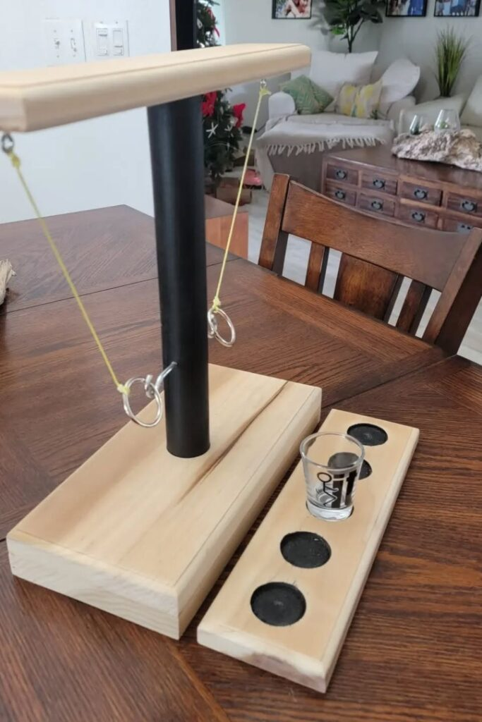 Players aim rings at a classic wooden board, perfect for casual or competitive play.