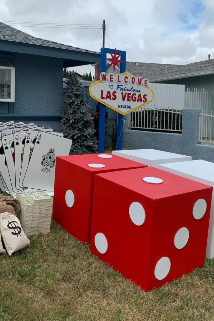 Oversized dice, cards, and playful money bags make for glamorous, themed gatherings.