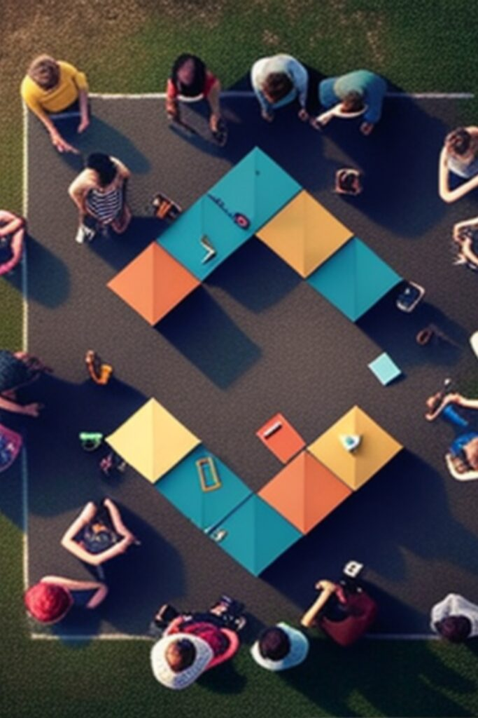Create a grid on the floor using tape or chalk. Split into small teams. Each team moves through the grid, completing a simple task at each square.
