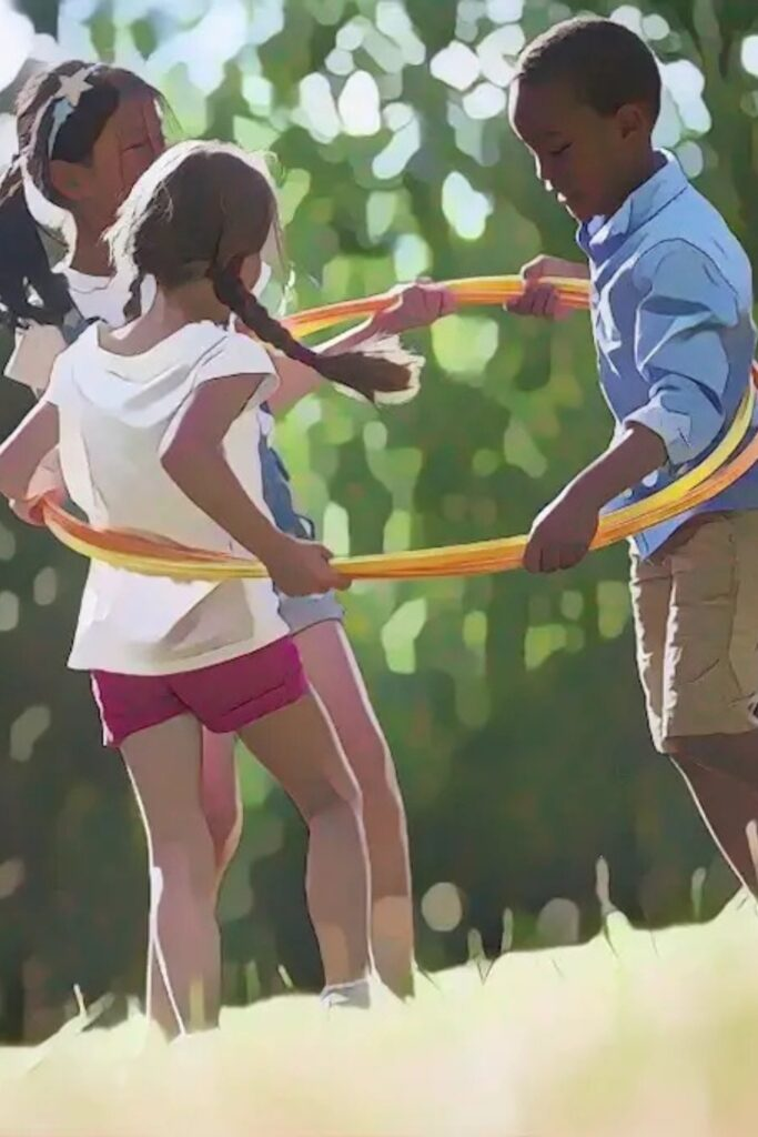 The goal is to pass the hoop all the way around the circle without letting go of each other’s hands. This is a fun and cooperative challenge.