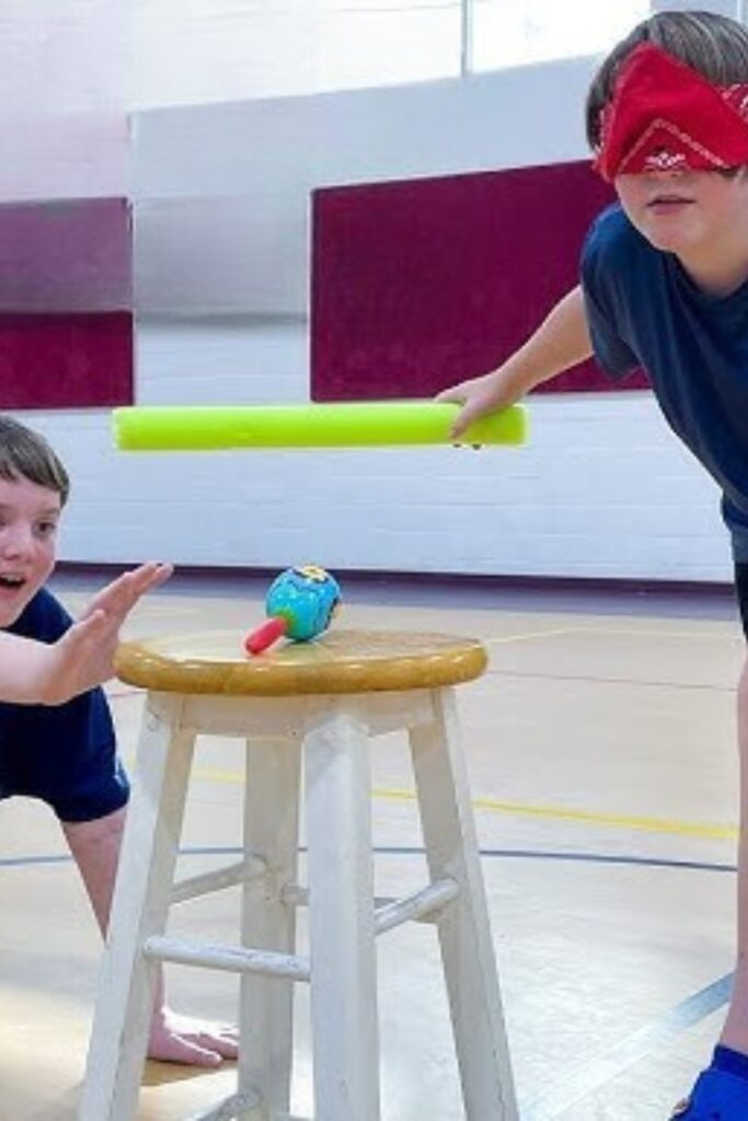 One player wears a blindfold. Their teammate guides them with voice instructions to tap a target with a soft stick.